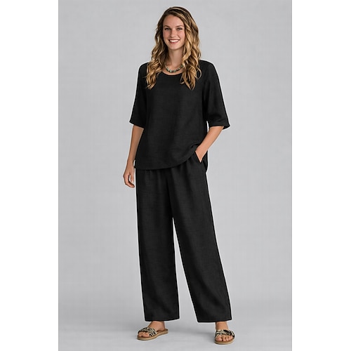 completi da donna in cotone e lino, completi da casa comodi e alla moda, tinta unita, arancione, rosso, blu navy, nero, bianco, verde scuro, primavera autunno