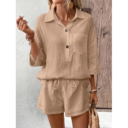 Per donna Set di Pantaloncini Manica Lunga Colletto a Camicia Tinta unica Moda Streetwear Casuale Quotidiano All'aperto Nero Bianco Giallo Estate Vestibilità comoda