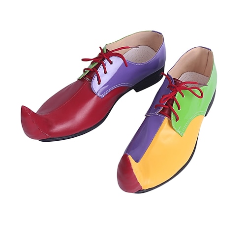 scarpe da clown colorate da uomo con pannelli multicolori e lacci rossi, divertenti stile giocoso per costumi di carnevale e da clown