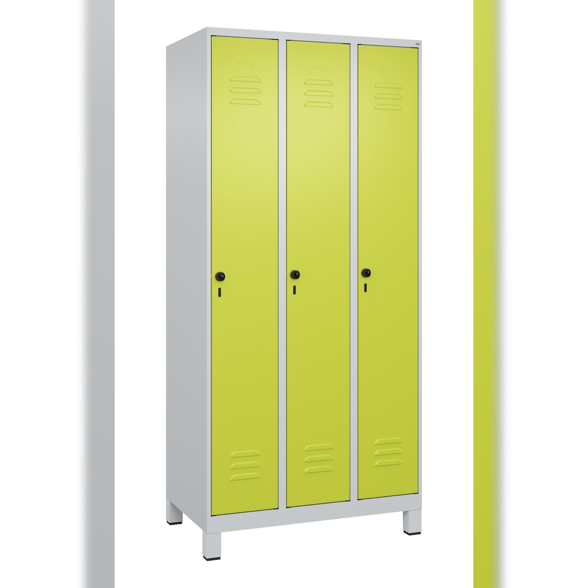 C+P Spind Classic PLUS, Füßen, 3 Abteile, HxBxT 195x90x50cm, Sicherheitsdrehriegel, Hellgrau/Clowngrün von PROREGAL