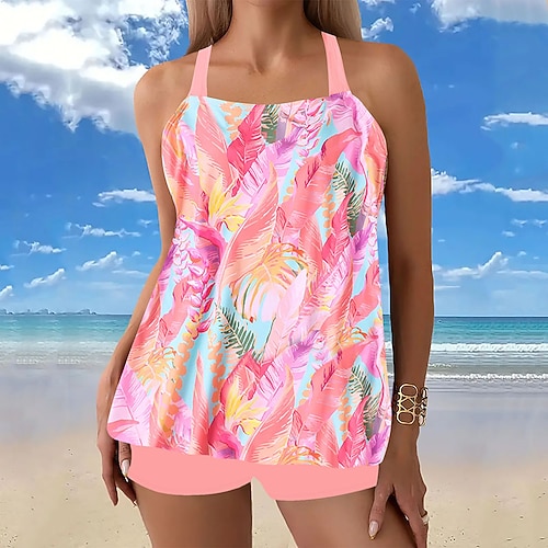 Costume da bagno tankini 2 pezzi donna gamba a boy controllo pancia vita alta snellente senza schiena vacanza spiaggia indossare floreale collo a V senza maniche