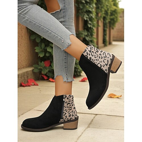 stivaletti da donna con stampa leopardata nera: stivaletti alla moda in finta pelle scamosciata con cerniera laterale, perfetti per la moda autunnale e gli outfit di tutti i giorni