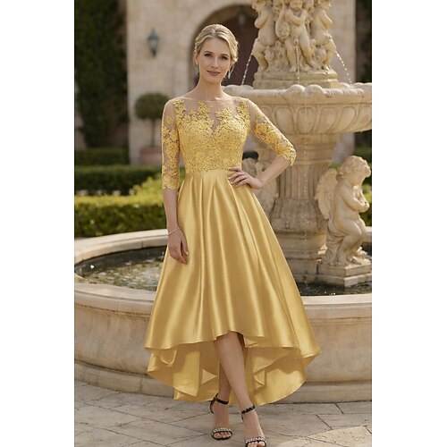 Linea ad A Asimmetrico Lunghezza Tè Vestito da Festa Abito da Cocktail Abito da invitata a nozze Abito da cerimonia per signora Manica 3/4 Scollo Tondo Elegante Alto Basso Ospite di nozze Compleanno