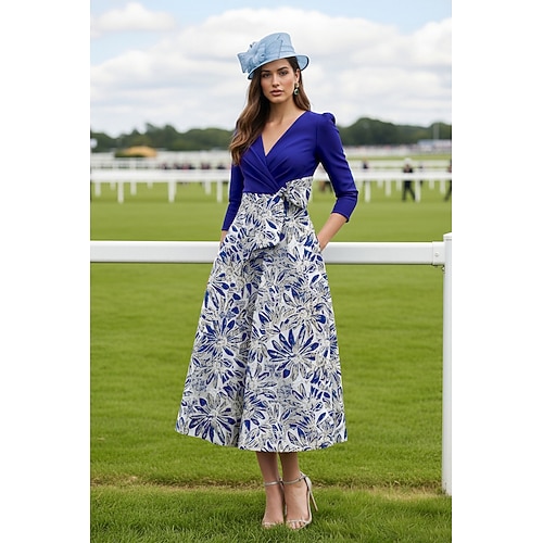Linea ad A Lunghezza Tè Vestito da Festa Abito da Cocktail Abito da invitata a nozze Abito da cerimonia per signora Manica 3/4 Scollo a V Elegante Formale Ospite di nozze Raso con Fiocco/Fiocchi