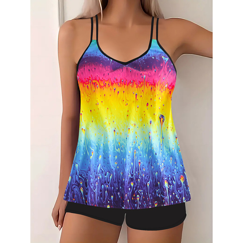 Women's Tankini 2 Piece Swimsuit Shorts Tummy Control High Waist Slim Backless Vacation Beach Wear Ombre Color Block V Neck Sleeveless Bathing Suits