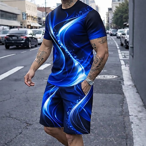 Herren Geometrisch Linie 2St T-Shirts-Sets Sommeroberteile Kurzarm Kurze Hosen Rundhalsausschnitt Lässig Täglich Outdoor Ausgehen 3D-Druck Sommer Blau Rote Purpur