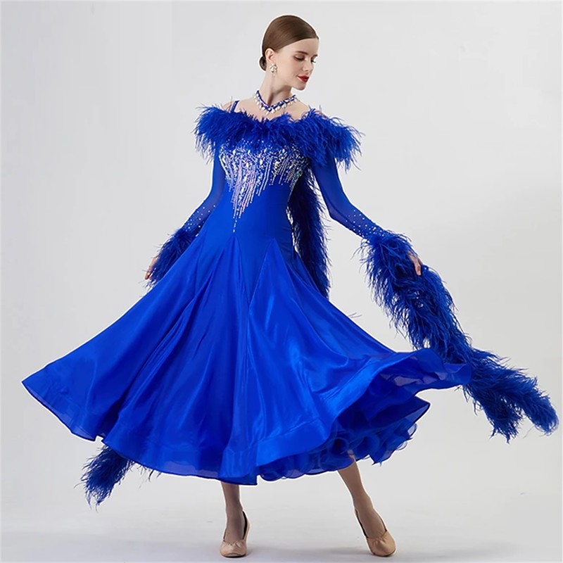 Women's Ballroom Dance Dress Feather Rhinestone Long Sleeve Waltz Tango Competition Performance Gown Elegant Flowing Skirt – Royal Blue