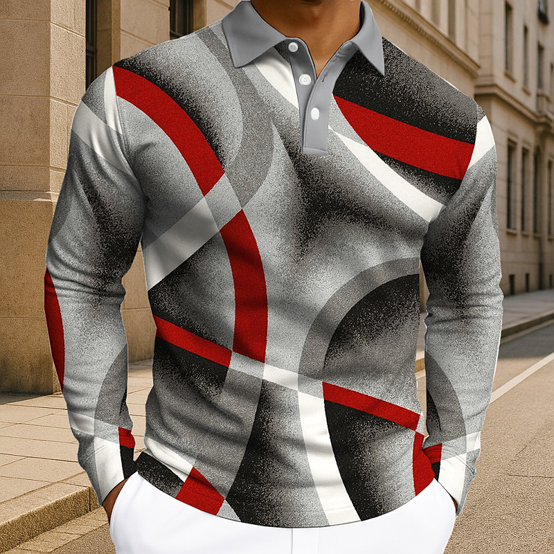 Men's Geometic Polo Long Sleeve Polo Shirts Lapel Casual Athleisure Daily Wear 3D Print Buttons Spring Fall Winter Red Blue Green