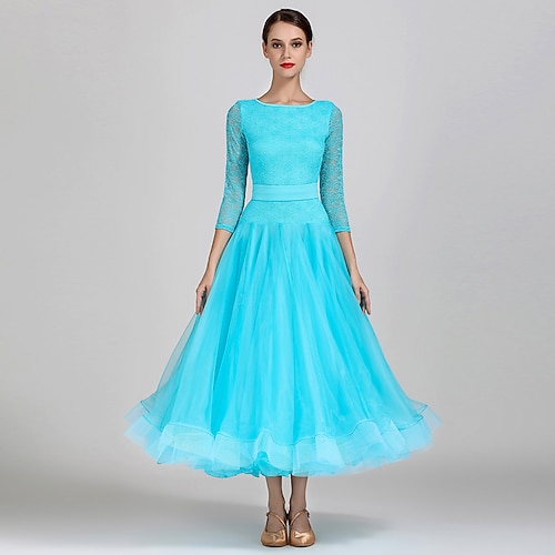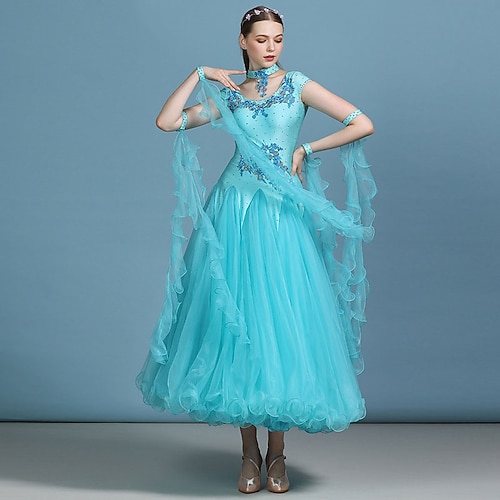 abito da ballo da sala da donna, elegante abito da competizione in organza a strati con applicazioni floreali blu acqua e strass, per valzer, tango e foxtrot