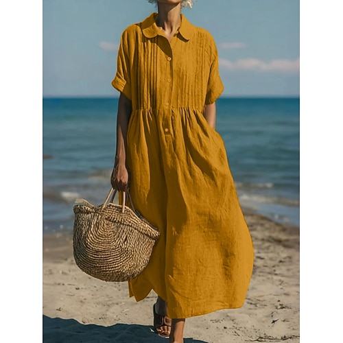 Per donna Abito Midi Finto cotone e lino Abito Camicia Vestito a caftano Moda Moderno Quotidiano All'aperto Vacanza Vestibilità regolare Semplice Manica Corta Colletto a Camicia Blu Nero Bianco Giallo