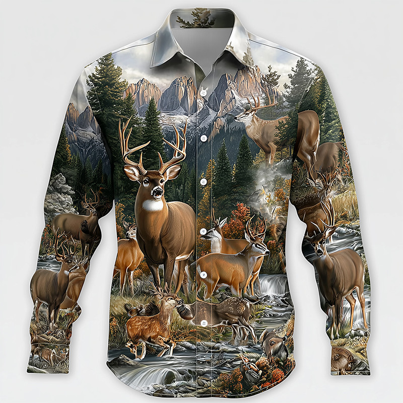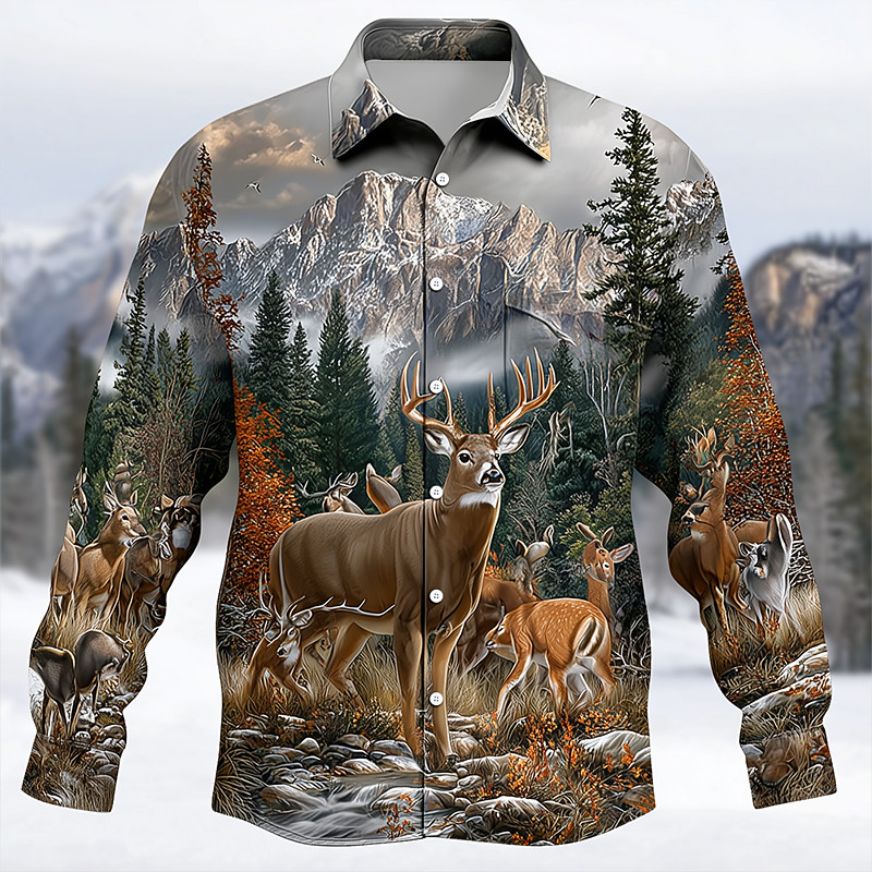 Men's Reindeer Nature Forest Shirt Button Up Shirt Long Sleeve Vintage Retro Outdoor Camping Hiking Hunting Spring Fall Turndown 3D Print Collared Shirts Blue Khaki Light Grey Gray Light Blue