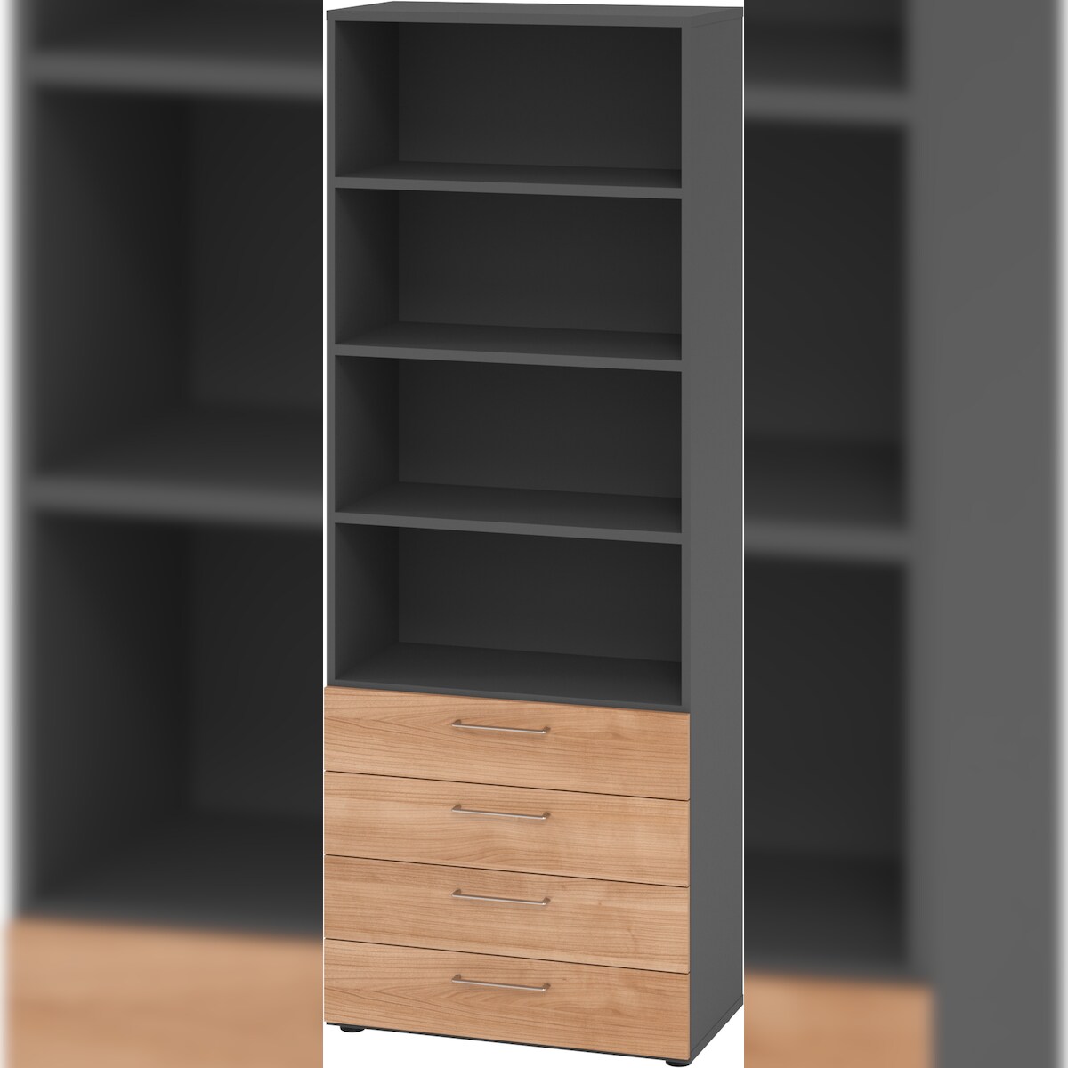 bümö smart Schubladenschrank, Büroschrank in Graphit/Grau mit 4 Schüben - Bürocontainer aus Holz, Container mit Metallgriffen & Soft-Stop Schubladen