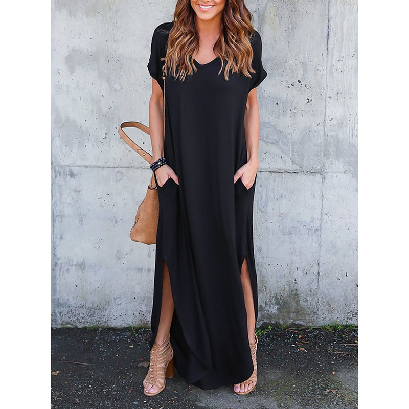 Women's Casual Dress Long Dress Maxi Dress Cotton Pocket Split Date Maxi Basic V Neck Short Sleeve Black White Pink Color