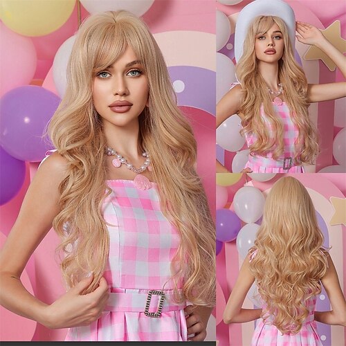 parrucca lunga rosa ondulata per le donne parrucca rosa ombre radice scura 26 pollici con frangia parrucca riccia ondulata parrucca in fibra sintetica resistente al calore dall'aspetto naturale per