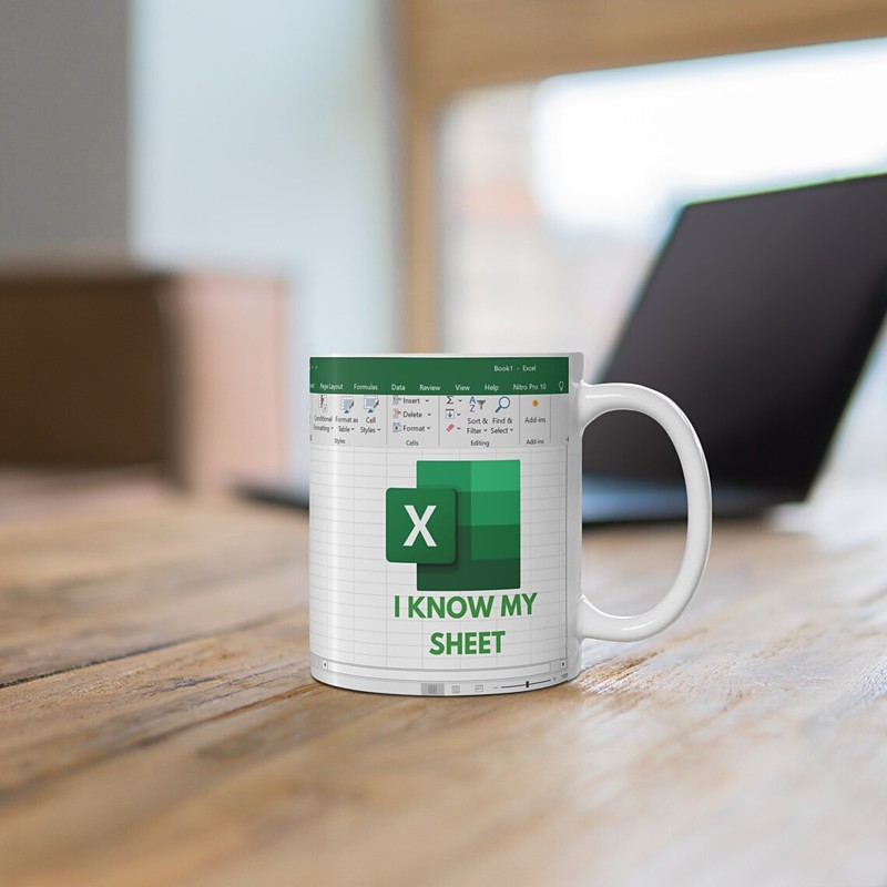 Excel Mug, Funny Office Ceramic Coffee Cup 330ml/12oz, Spreadsheet Themed White Collar Gift for Coworker, Analyst, Accountant, Boss, Work Desk Decor