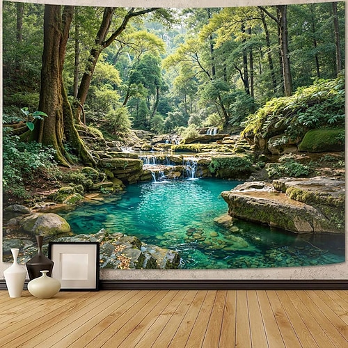 Arazzo con tranquillo ruscello nella foresta, cascate e laghetto cristallino, rilassante decorazione murale per la casa, perfetto per la camera da letto o il soggiorno