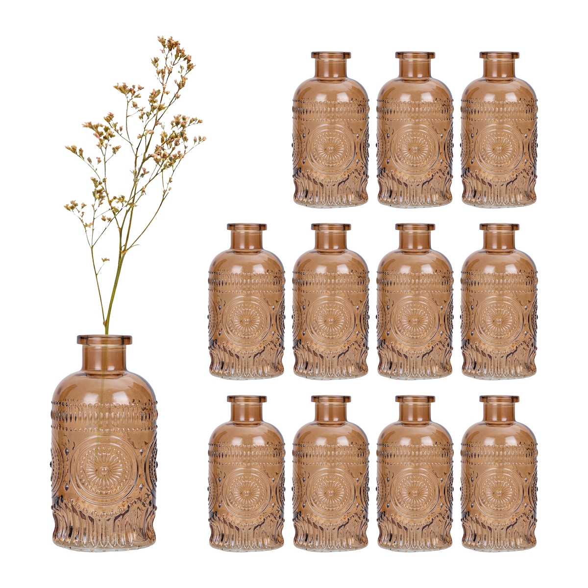 Relaxdays Glasvase, 12er Set, Deko-Vase, geprägtes Vintage-Design, HD: 13x6 cm, Mini-Vasen für Tischdeko, Glas, braun