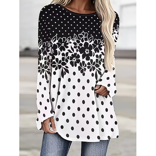 Per donna Maglietta Floreale Grafico A Pois Vintage Elegante Classico Manica Lunga Girocollo Top Regolari Quotidiano Stampato Bianco / Nero Nero Bianco Primavera Autunno