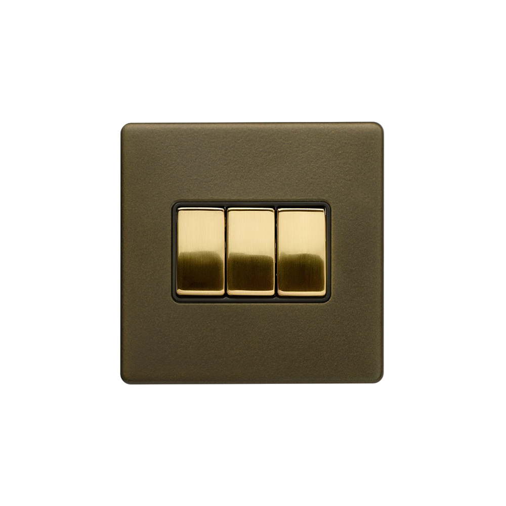 Soho Lighting Bronze & Brushed Brass 10A 3 Gang Intermediate Switch Black Inserts Screwless - Size: 146mm x 86mm
