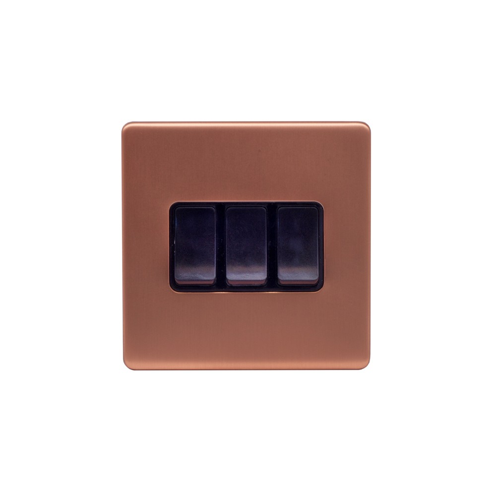 Lieber Brushed Copper 10A 3 Gang 2 Way Switch - Black Insert Screwless - Size: 86mm x 86mm x 2 mm