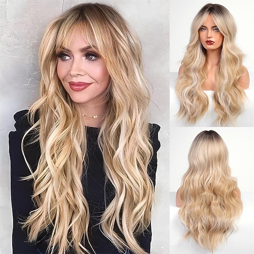 parrucca lunga rosa ondulata per le donne parrucca rosa ombre radice scura 26 pollici con frangia parrucca riccia ondulata parrucca in fibra sintetica resistente al calore dall'aspetto naturale per