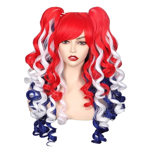 Parrucca Cosplay Riccia Lunga American 250 con 2 Codini (Rosso/Bianco/Blu)