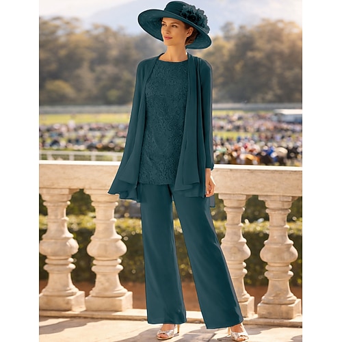Completo Tuta 3 Pezzi Abito da Sposa di Lunghezza Piena Abito per Madre della Sposa Senza Maniche Manica Lunga Collo Barchetta Elegante Vintage Semplice Formale Ospite di Nozze Chiffon con Pizzo