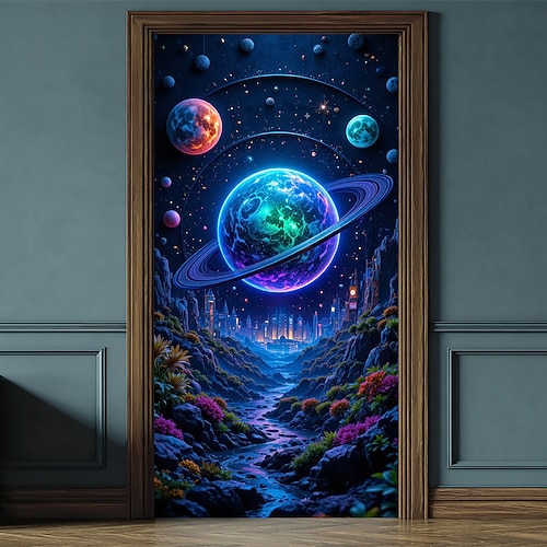Sci-Fi-Türbanner mit kosmischem Planeten-Stadtbild, leuchtend blau umrandetem Planeten, Galaxienportal, futuristischer Landschaft, Türverkleidung für Schlafzimmer, Spielzimmer, Eingangsbereich,
