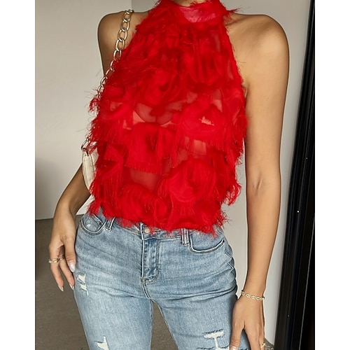 Damen T Shirt Tank Top Einfarbig Elegant Mode Ärmellos Hoher Ausschnitt Normale Oberteile Täglich Ausgehen Wochenende Netz Schwarz Rote Khaki Sommer Frühling