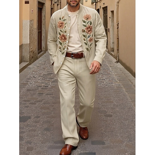 Herren Leichte Jacke Freizeitjacke Set Urlaub Täglich Atmungsaktiv Stickerei 2 teilig Frühling Herbst Blumen Mode Klassisch Stehkragen Regulär Gelb Blau Jacken