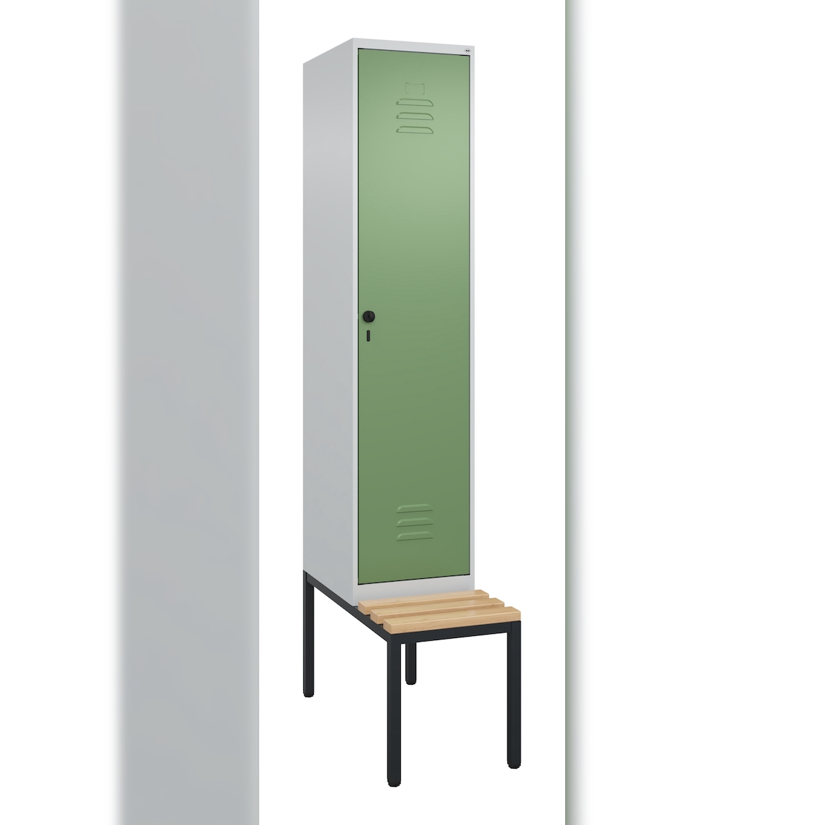 C+P Spind Classic PLUS, Buche untergebaute Sitzbank 1 Abteil, HxBxT 212x40x82cm, Sicherheitsdrehriegel, Hellgrau/Resedagrün von PROREGAL