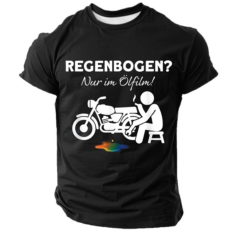 Mens Funny Mechanic Graphic T-Shirt - Rainbow? Only in the Oil Film! German Motorcycle Short Sleeve Tee for Car Bike Enthusiasts