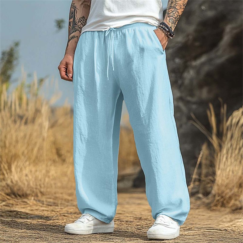 Men's Linen Pants Trousers Summer Pants Baggy Pants Beach Pants Drawstring Elastic Waist Straight Leg Plain Comfort Breathable Full Length Home Yoga Holiday Vacation Fashion Black White Inelastic
