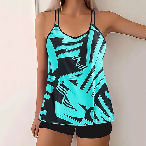 Costume da bagno Tankini da donna 2 pezzi con pantaloni corti controllo della pancia alta vita snellente senza schienale abbigliamento da spiaggia per le vacanze geometrico a righe scollo a V senza