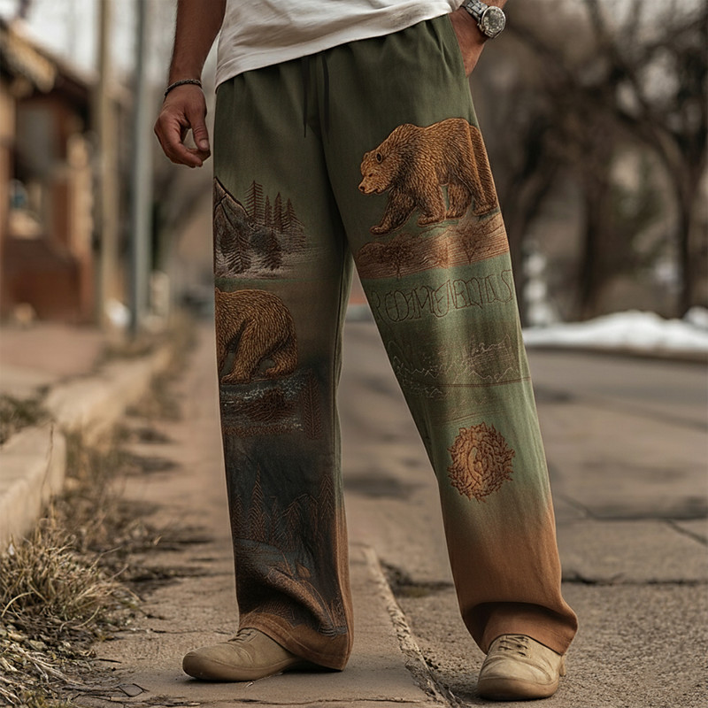 Men's Animal Bear Nature Pants Trousers Casual Pants Mid Waist Drawstring Elastic Waist Vintage Retro Outdoor Camping Hiking Hunting Straight Leg Trousers Spring Fall 3D Print Green khaki
