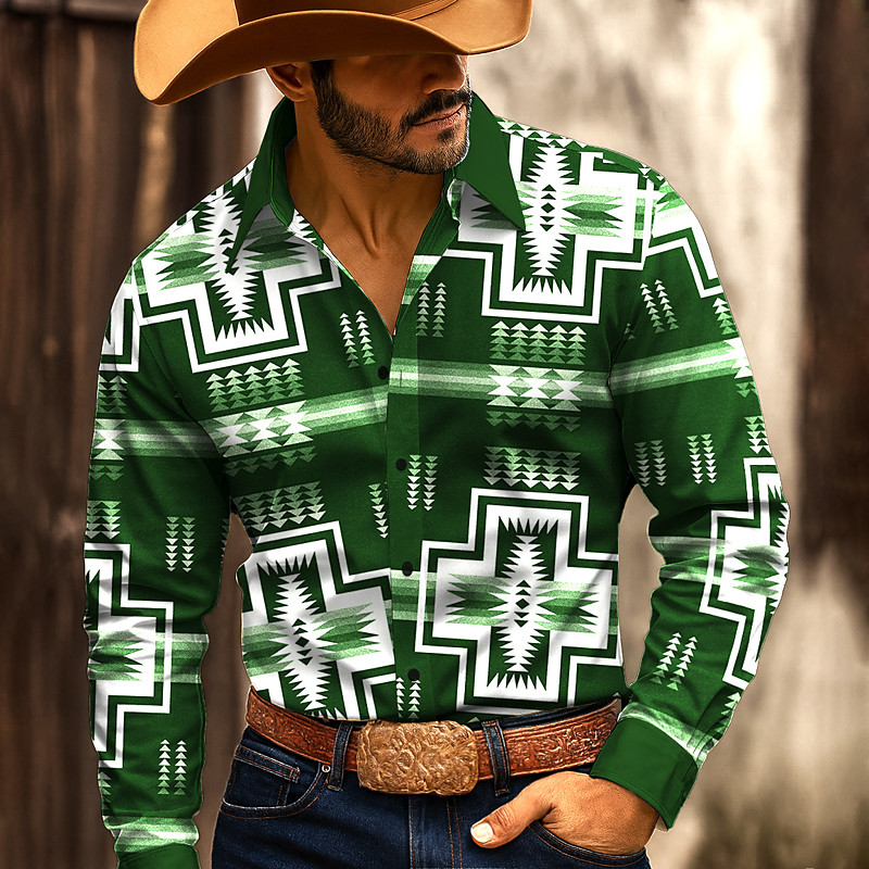 Men's Aztec Geometric Pattern Ethnic Shirt Western Shirt Button Up Shirt Long Sleeve Vintage Retro Outdoor Casual WorkWear Spring Fall Turndown 3D Print Collared Shirts Black Burgundy Blue Green