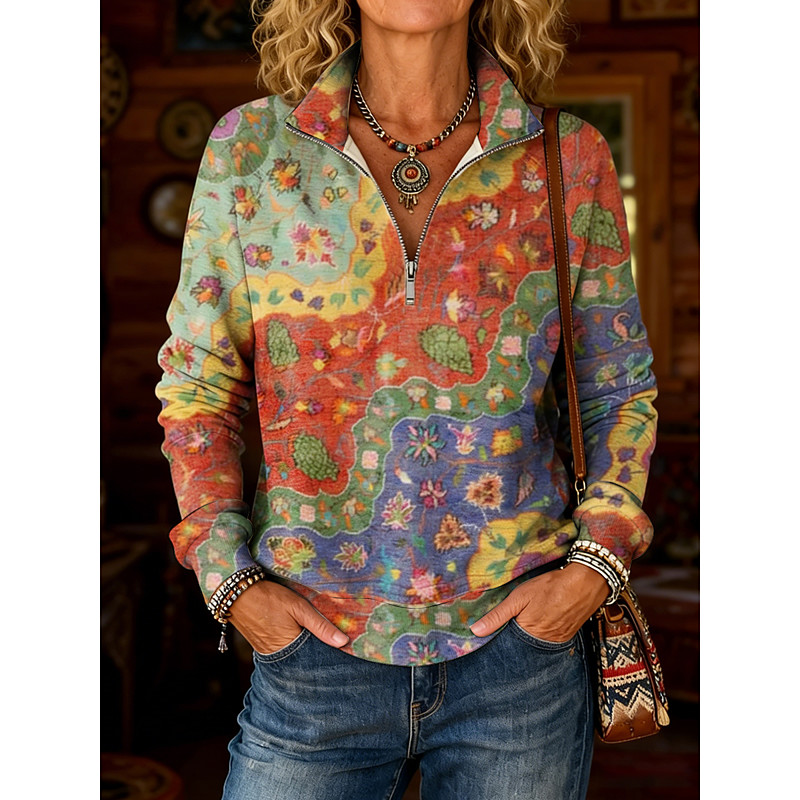 Women's Pullover Sweatshirt Floral Graphic Casual Long Sleeve Half Zip Regular Tops Casual Dailywear Holiday Zipper Yellow Red Spring Fall