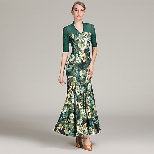 abito da ballo da sala floreale da donna, stile cheongsam verde, colletto in rete, maniche corte, abito a coda di pesce, abito da competizione standard per valzer e tango