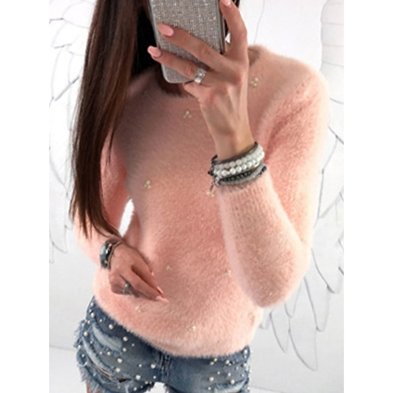Women's Pullover Sweater Jumper Stylish Casual Soft Solid Color Ribbed Crew Neck Beads Long Sleeve Regular Tops Knit Outdoor Daily Going out Black White Fall Winter