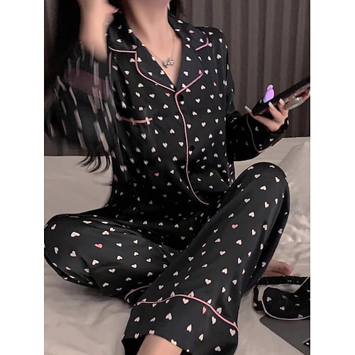 Per donna Set Pigiama Casual Comfort Cuore Grafico Leopardo Elastico in vita Pantalone Quotidiano Casa Manica Lunga Bavero Blu Nero Rosa Fucsia Arcobaleno Estate Primavera Vestibilità comoda