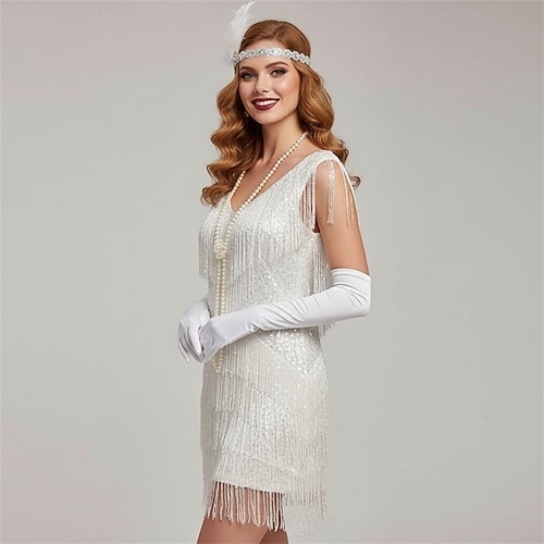 Anni Ruggenti Anni 1920 Mini Abito Flapper Vestito Abito da cocktail Senza maniche Il grande Gatsby Paillettes Scollo a V profondo Costume Per donna Natale Carnevale Mascherata Festa a tema retr