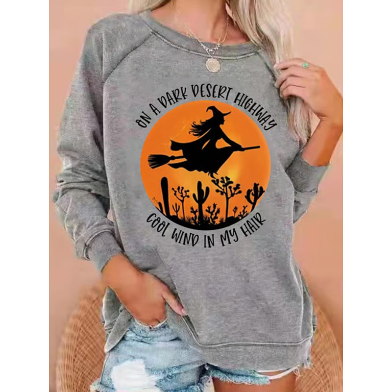 Women's Pullover Sweatshirt Witch Graphic Fashion Casual Long Sleeve Crew Neck Round Neck Regular Tops Casual Print White Light Green Wine Blue Light Grey Fall Winter