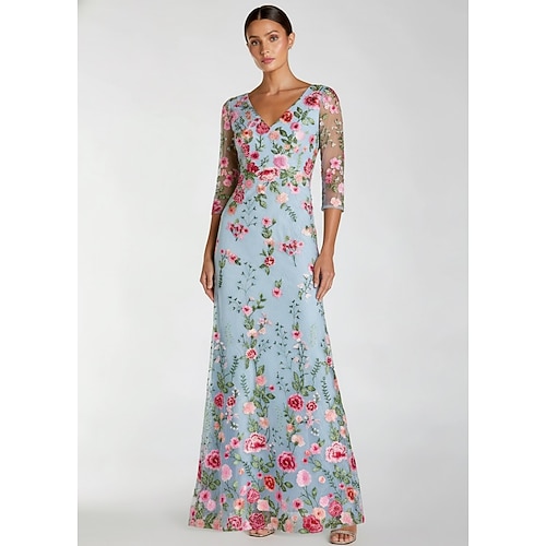 Linea ad A Abito Lunghezza al pavimento Abito da invitata a nozze Abito da cerimonia per signora Manica 3/4 Scollo a V Scollo Illusione Elegante Vintage Formale Ospite di nozze Semi-Formale Chiffon