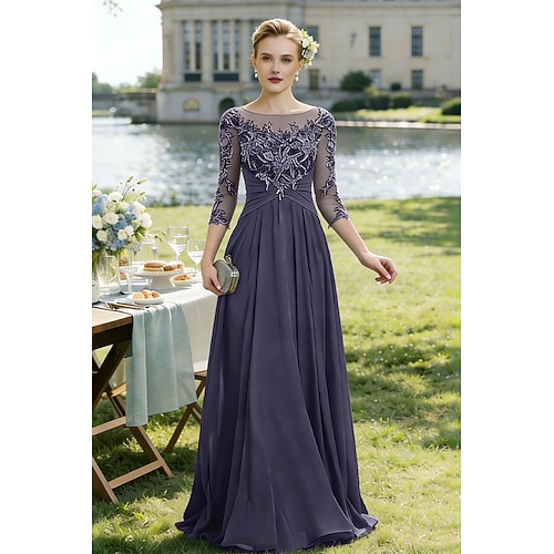 Linea ad A Lunghezza al pavimento Abito da invitata a nozze Abito Formale Abito da sera Abito da cerimonia per signora Manica 3/4 Collo gioiello Elegante Ricevimento di matrimonio Chiffon Pizzo con