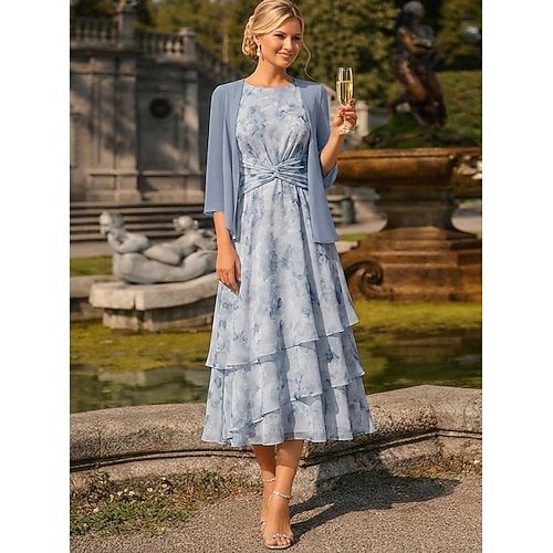 Due Pezzi Linea ad A Lunghezza Tè Abito da invitata a nozze Abito da cerimonia per signora Senza Maniche Manica 3/4 Girocollo Elegante Semplice Minimalista Formale Semi-Formale Chiffon Jacquard con