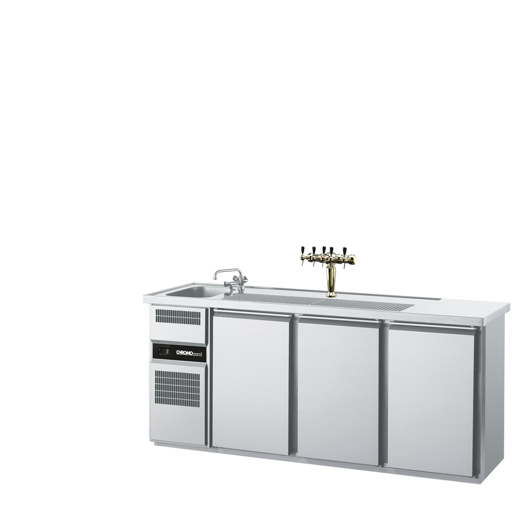 CHROMOnorm Getränketheke mit einem Becken links und 3 Türen