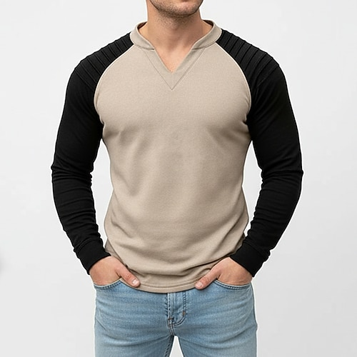 T-shirt da uomo in finta pelle scamosciata, manica lunga, scollo a V, design antirughe, plissettata, autunno inverno, color block, vintage, quotidiano, retrò, arricciato, color block, per esterni,