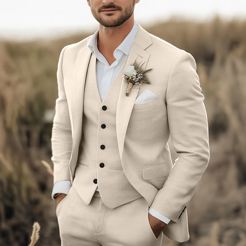 Men's Wedding Linen Suits Notch Lapel Sky Blue Khaki Solid Colored Tailored Fit 3 Piece Single Breasted Two-buttons