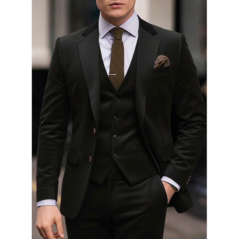 Men's Business Business Suits Notch Lapel Black Brown Business Solid Colored Tailored Fit 3 Piece