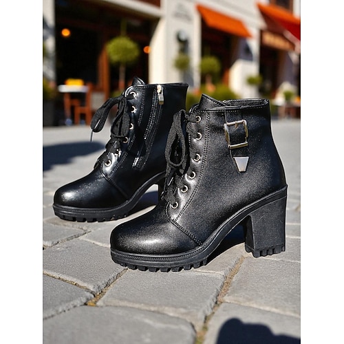 stivaletti da donna con tacco grosso e lacci marroni – stile combat in similpelle con cerniera laterale e fibbia, ideali per outfit autunnali, attività all'aperto e streetwear casual